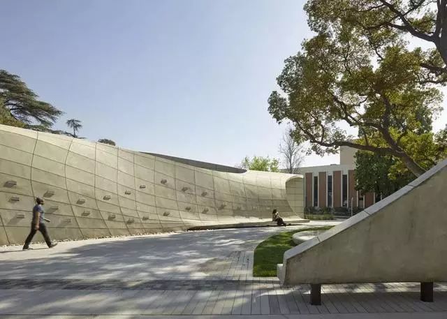 游客可以在树荫下呼吸新鲜空气。 在两堵混凝土墙的表面安装了75个领导的背光板,以突出该设施的许多里程碑,同时为休憩,静坐留下空间。