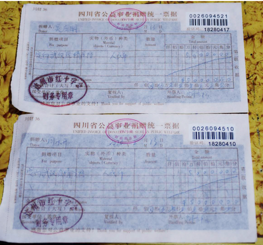 随后,工作人员向两位老人开具了四川省公益事业捐赠统一票据,并向两位老人承诺:“二老放心吧!这笔善款达州市红十字会将会以最快速度转交给武汉市红十字会,用于武汉市疫情防控医疗救助工作。”
