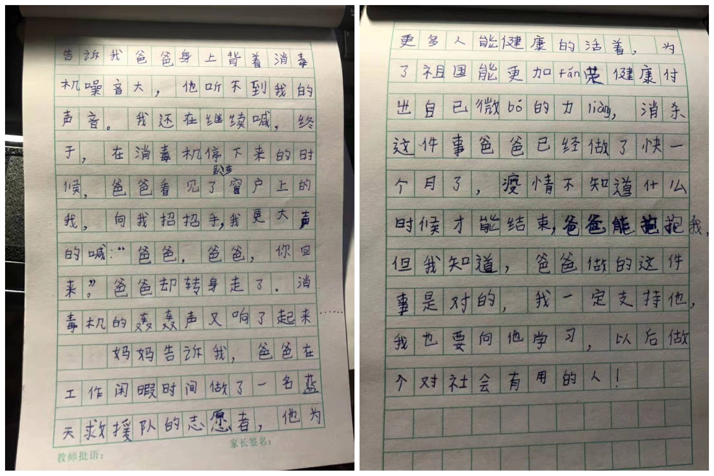 “他听不到我的声音,我还在继续喊,终于,在消毒机停下来的时候,爸爸看见了趴在窗户上的我,向我招招手,我更大声地喊:‘爸爸、爸爸,你回来’……”这是蓝天救援队队员李涛分享在朋友圈里作文《我的志愿者爸爸》。
