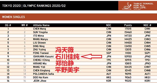2020东京奥运会,各国只有2个单打名额。按照国际乒联网站列出的奥运会积分排名(2020年2月数据),中国乒乓球队占据前2是稳稳的,前十位中依序有陈梦、孙颖莎、王曼昱、刘诗雯、丁宁、朱雨玲;而日本队伊藤美诚目前排名第3。