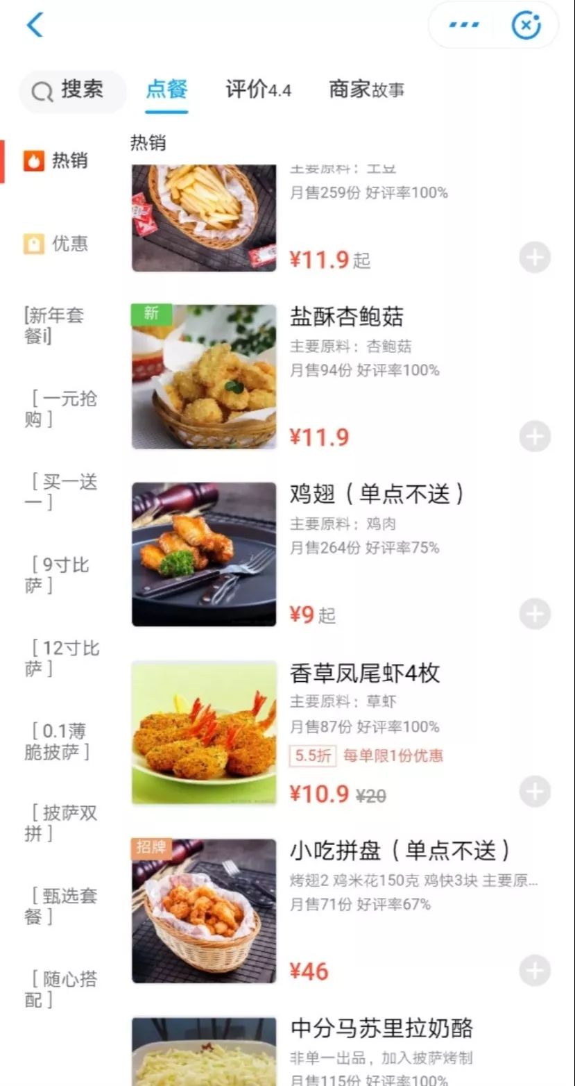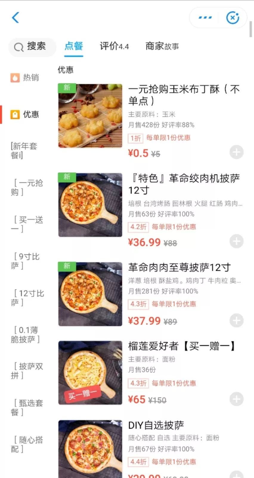 有了炸鸡汉堡,下一步就是披萨了,榴莲披萨买一送一,还有超值5毛抢购玉米布丁酥,各种小食拼盘一应俱全。