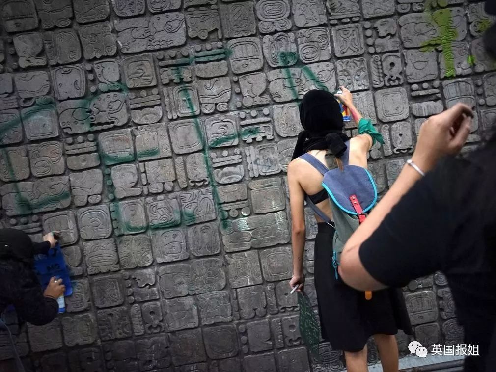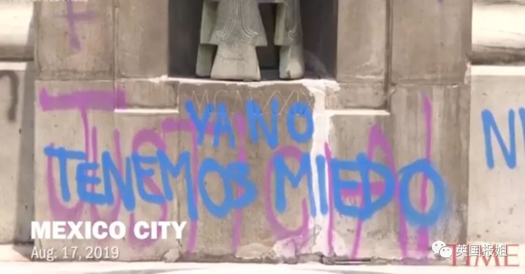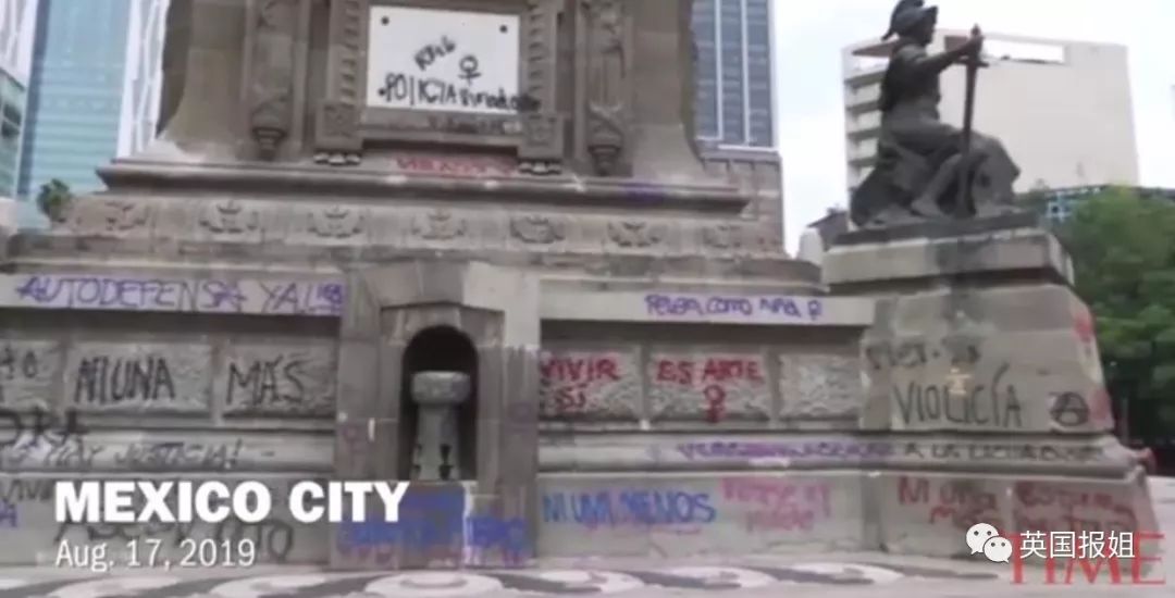 在墨西哥城最著名的地标之一——“独立天使”雕像上涂鸦写下“性侵之地”,