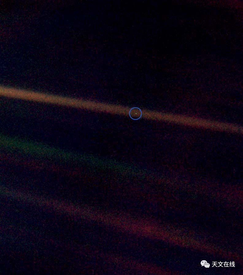 图解:这是从40亿英里外的太空拍摄的地球照片,可见地球只是太阳光束上的一个小点而已(图中被人工加上的蓝圈内小点)