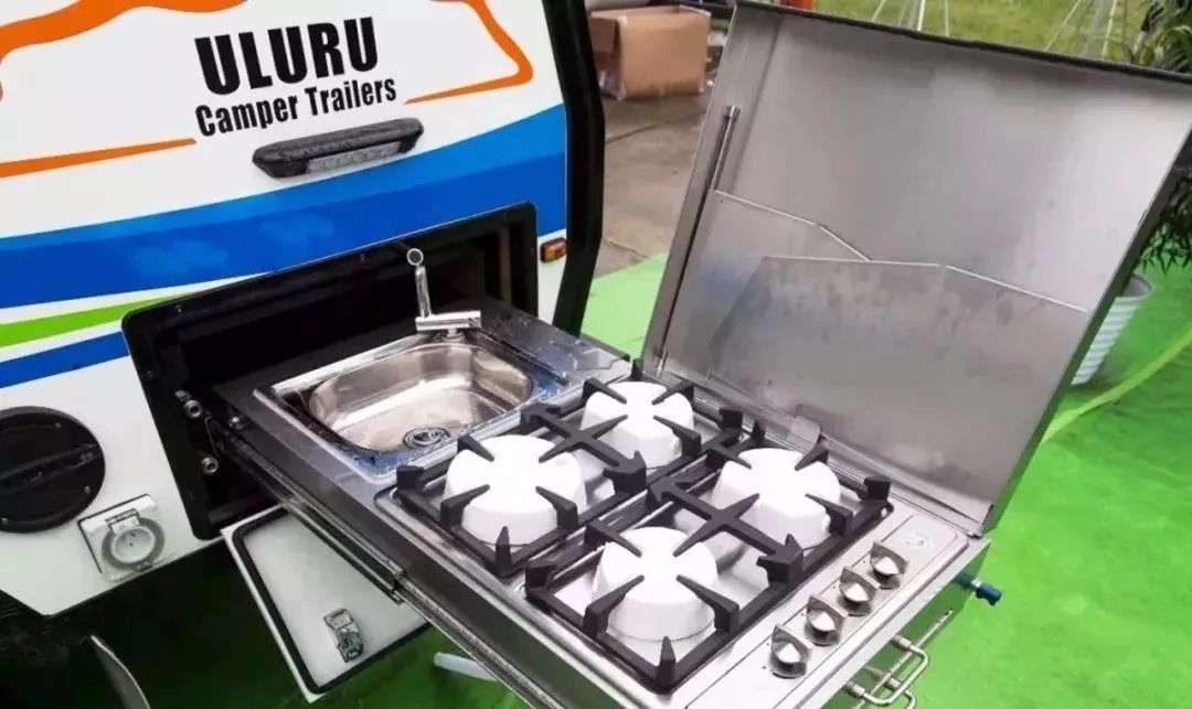 厨房区域在车厢的中部,配有洗菜池、电磁炉和一些储物柜,煮饭建议在外面,因为配备有外置抽拉式燃气灶,也有洗手池,满足简单的烹饪条件,市电接口和接水口在外面都有。