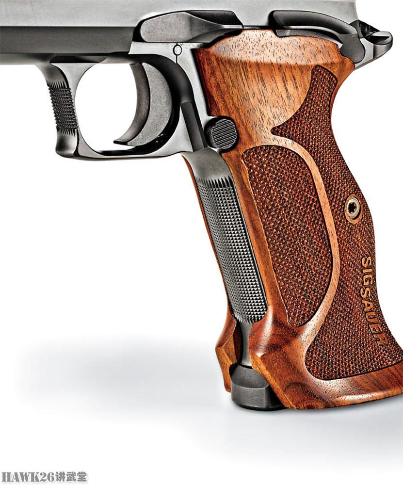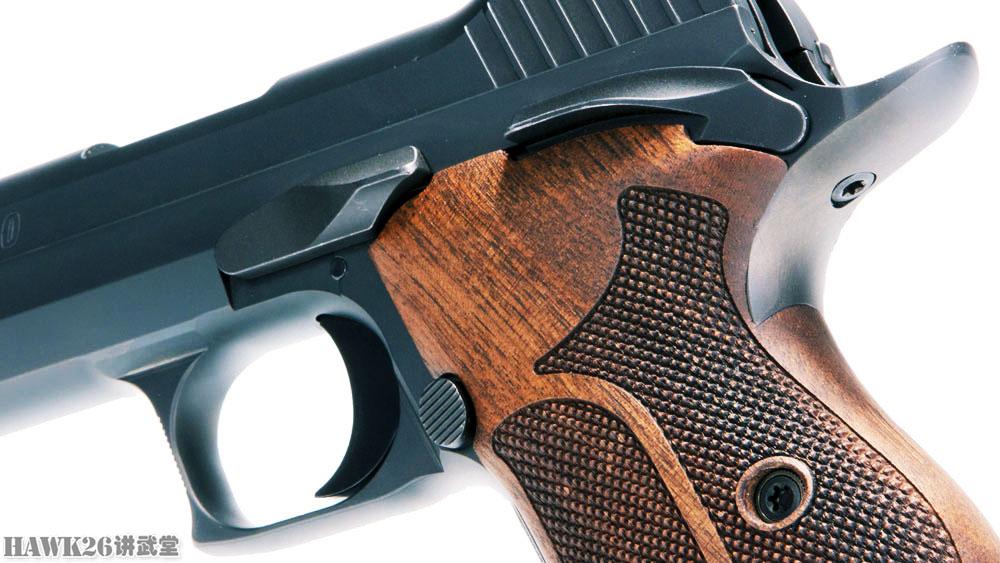 P210“目标”木制握把上有雕刻精美的方格防滑纹路,除了方格外的木制握把表面如丝绸般光滑细腻。防滑纹路贴合手型,将西格绍尔名称巧妙融入到握把上。木制握把通过梅花形螺栓固定在套筒座上,握把前方是开放形的,握把前部外露的金属部分同样有方格形防滑纹路。P210以性能出色的两道火单动扳机而闻名,笔者拥有的这支P210“目标”扳机运行平滑,击发干脆,平均扳机力为15.8 N。