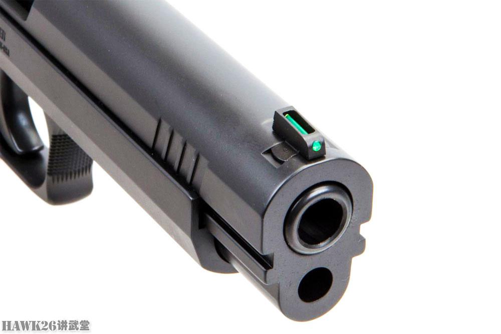 可以调节的方形缺口照门后部有精密的横向锯齿纹路,防止产生虚光。很多人抱怨旧版P210的套筒座后部突起太短,如果手型较大,射击时翻转的击锤可能会击中虎口位置。P210“目标”的这个部分进行了加长,类似定制型1911海狸尾设计。击锤在向后翻转时,会落入海狸尾顶部的矩形凹槽中,完全不会有击中虎口的问题。