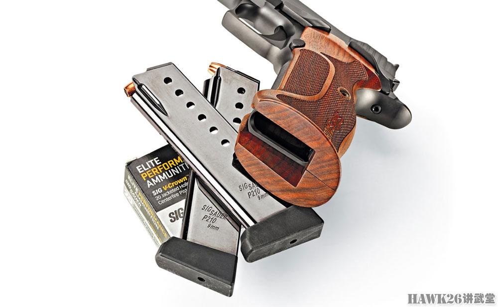 P210“目标”随枪附送两个八发单排弹匣,弹匣侧面有七个余弹观察孔和可以拆卸的弹匣底板。由于弹匣卡笋的更改,新版弹匣右侧有一个缺口,在按下弹匣卡笋后,弹匣会自由掉落,配合弹匣仓口附近的木制握把喇叭形切削,方便快速装填。而旧版P210手枪则配备“欧洲式”弹匣卡笋。手动保险的位置与1911相同,方便右手拇指进行操作,在安全位置时,扳机和扳机连杆均被锁定。尽管有内置击针保险,但P210并没有握把保险。