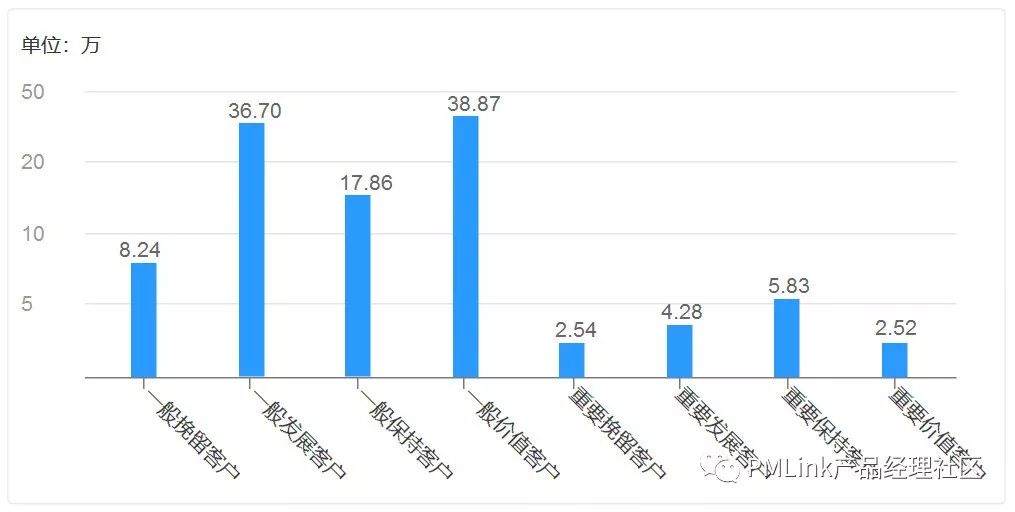 通过R、F、M三个维度,将用户有效地细分为8个具有不同价值的群体: 重要价值客户、重要发展用户、重要挽留用户、重要保持客户、一般价值客户、一般发展用户、一般挽留客户与一般保持客户。