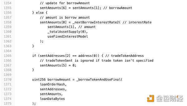 同样在_borrowTokenAndUse()中,在amountIsADeposit == true的情况下,在1355行中将sendAmounts [1]的值填充为sendAmounts [6](将在后面看到)。稍后,在第1370行中调用_borrowTokenAndUseFinal()。