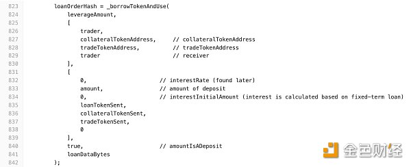如上图所示,marginTradeFromDeposit()在第840行将第四个参数设置为true的情况下调用_borrowTokenAndUse()