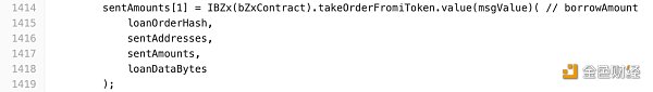 在第1414行中,_borrowTokenAndUseFinal()通过IBZx接口调用takeOrderFromiToken(),以使交易流进入bZxContract。