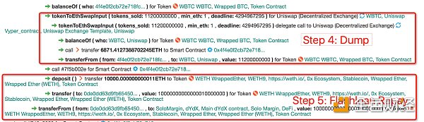 4:出货。随着Uniswap中WBTC价格的飙升,攻击者将Uniswap中从Compound中借来的112 WBTC卖出换成WETH。