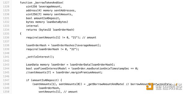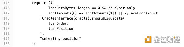 下面有趣的部分到了。在第145–153行中,有一个require()调用以检查该头寸是否健康。不幸的是,在loadDataBytes.length == 0 && sentAmounts [6] == sentAmounts [1]的情况下,完整性检查(sanity check)bZxOracle :: shoudLiquidate()被跳过了。这正是触发漏洞以避免完整性检查的条件。