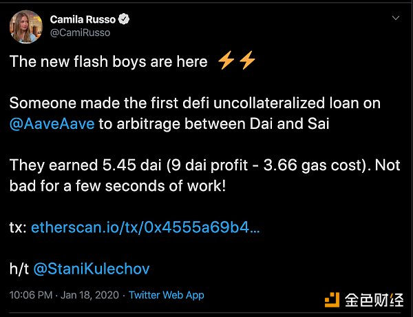 ArbitrageDAO于2020年1月18日完成第一笔无抵押的闪电贷。见下图Camilla Russo的报道。