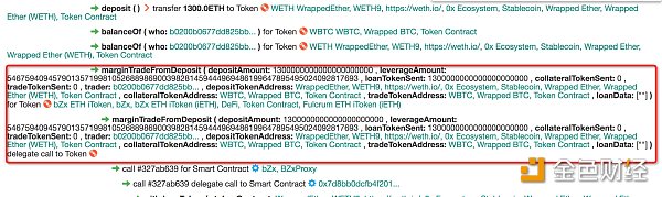 吸筹之后,此步骤利用bZx保证金交易功能以卖空ETH兑得WBTC(即sETHwBTCx5)。具体来说,攻击者存入1300 ETH并调用bZx保证金交易功能,即mintWithEther(连续调用marginTradeFromDeposit)。保证金交易功能利用KyberSwap将借入的5637.623762 ETH交换为51.345576 WBTC。请注意,5倍杠杆借入ETH。实质上将1 WBTC的兑换率提高到109.8 WETH,大约是正常兑换率(~38.5 WETH/WBTC)的三倍。