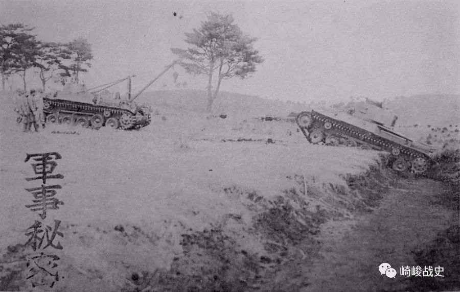 ■这幅罕见的照片展示了由九七式中战车改造的维修车(左)在拖曳一辆试制九八式中战车(右)。