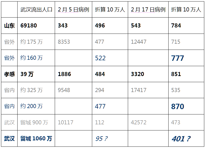 当然,175万还是一个比较粗糙的估算数字,有一些省市披露了具体的人口迁移数据。 如山东排查出了共计69180人从武汉回到山东,至今共发生543个病例。 再加上之前我们介绍过的孝感39万回乡人口,我们不再依赖日韩新撤侨数据,就能做出更加准确的估算: