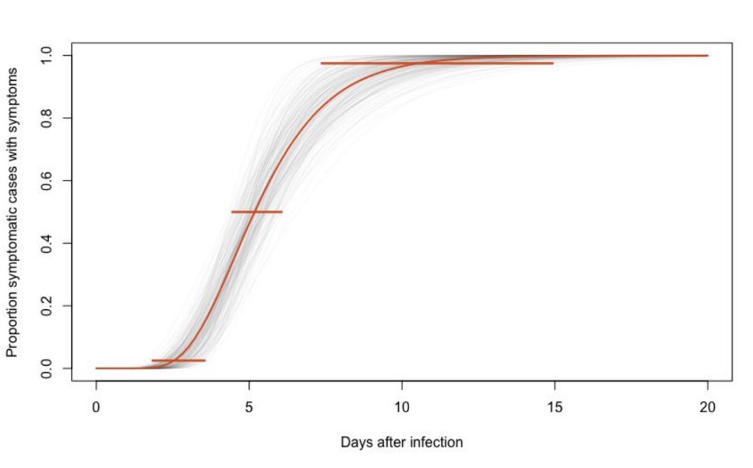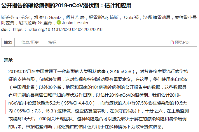 美国约翰霍普金斯大学彭博公共卫生学院等学者在2月4日预发表的论文,根据湖北省外的101个案例测算,97.5%的人会在10.5天内出现症状。 极个别的可以拖到20天以后。 估算超过14天才爆发的比例是0.75%。