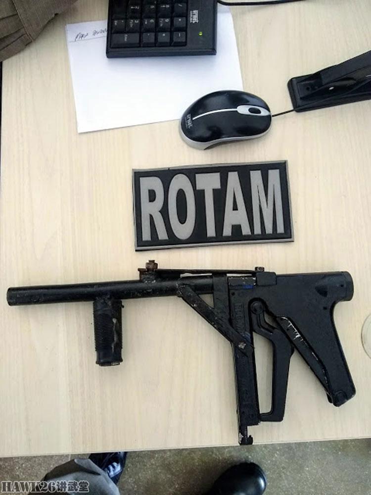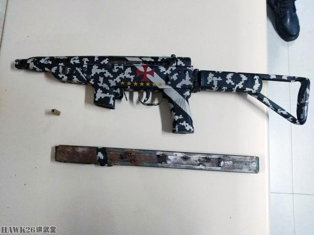巴西警方查获的一支.380 ACP口径的自制冲锋枪,有趣的是采用了数码迷彩涂装,上面还有某种特殊含义的铁十字和五角星。枪托和小握把是中国56-2式冲锋枪的标准部件,当然,最可能的是来自中国制造的5.6mm气枪,因为这种气枪也采用了这样的枪托和小握把。