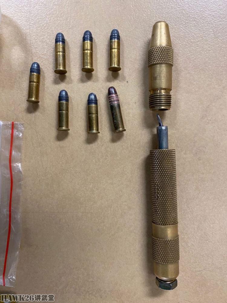 这是早些时候,澳大利亚警方缴获的“Zip Gun”,发射.22 LR弹药。这种以弹簧为动力,单发发射的枪械是所有自制枪械中结构最简单的,也是最普遍的一种。击针故意做成歪的,这是因为.22 LR弹药是边缘发火弹药。