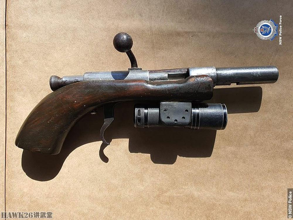 澳大利亚新南威尔士州警方查获的一支自制栓动手枪,没有扳机护圈,却可以加装一个手电筒。