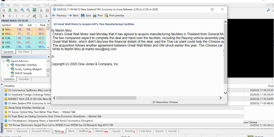 ATFX是一家与时俱进的差价合约经纪商,会根据金融市场的最新发展趋势,为投资者提供最前沿的新闻资讯和市场报道。2020年1月份开始,ATFX对MT4交易平台进行优化升级,在现有新闻资讯的基础上,最新增加了道琼斯通讯社的新闻服务,目前英文版本已经在欧洲上线,接下来将会陆续在全球更多国家上线,并提供多种语言供投资者灵活选择。