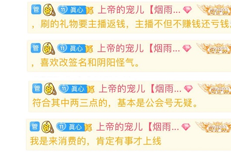在昨晚的活动中,烟雨楼的土豪上帝的宠儿在林真心的直播间豪刷了几十万的榜单并续费了几十次超神帝皇爵位。说完了礼物后上帝的宠儿便开始了聊天,他说到:最近这几天我去了某音平台玩,发现真的非常少公会号,上面的大哥是真的大哥,没有任何水分的。有游客就问那你跟我们说说公会号都有哪些特征呢?随后上帝的宠儿说到:1、大部分礼物刷给一个主播或者公会的。2、长时间在线,因为公会号需要看主播直播,这是他们自己的工作。3、刷礼物的钱需要返还给公会,主播不但赚到钱还会亏钱。4、喜欢改一些乱七八糟的签名。只要符合以上两到三个点,基本上都是公会号。我是来消费的,有事才会上线,只有公会号才会24小时在线,因为这是他们的工作。期间有人带节奏,说你就是公会号,还整这么多这哪的,我不信。