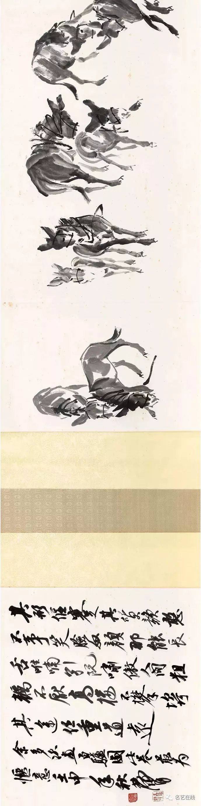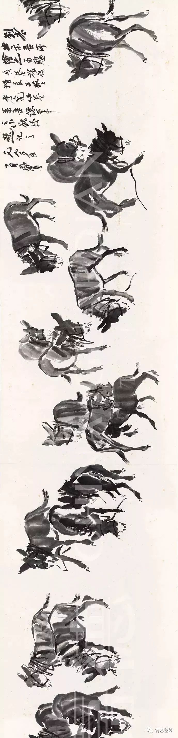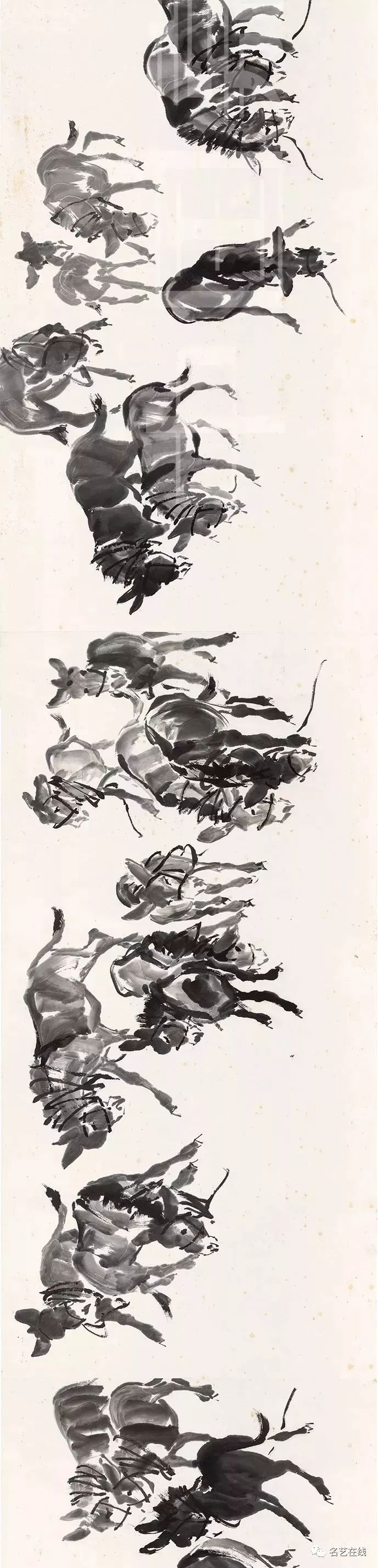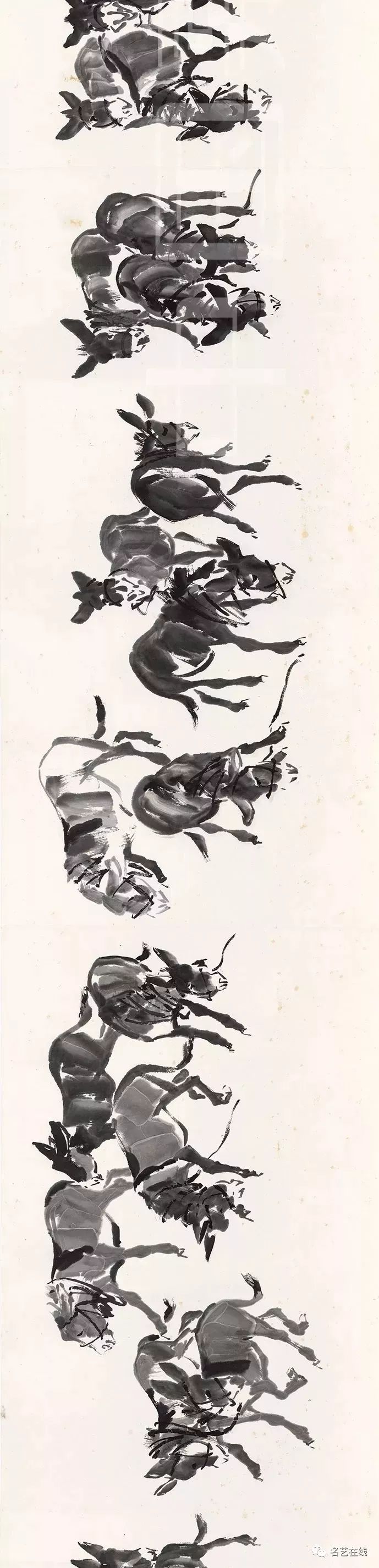黄胄的这幅驴图,画心长度达19.2米,以14张四尺整张宣纸前后相连而成,加之前后自题引首和后纸,长度逾21米,共绘119头毛驴,堪称黄胄画驴第一。