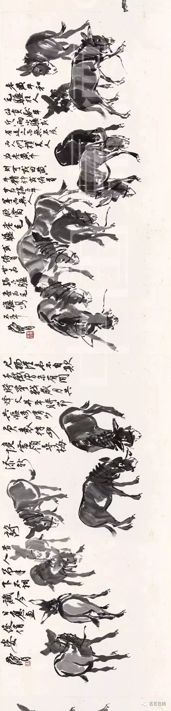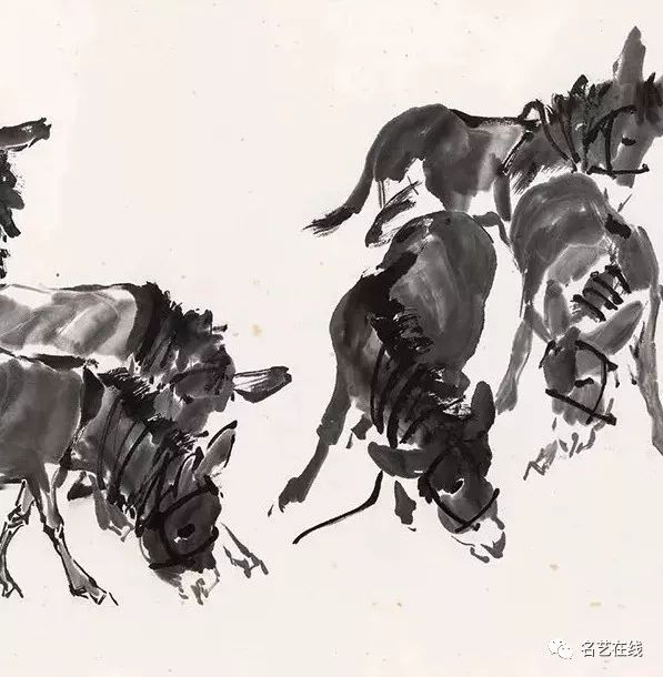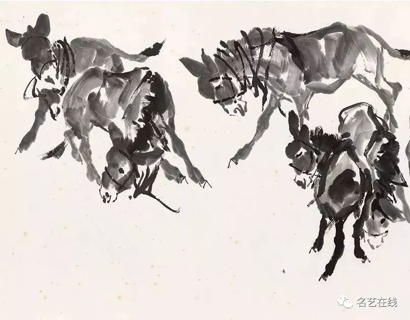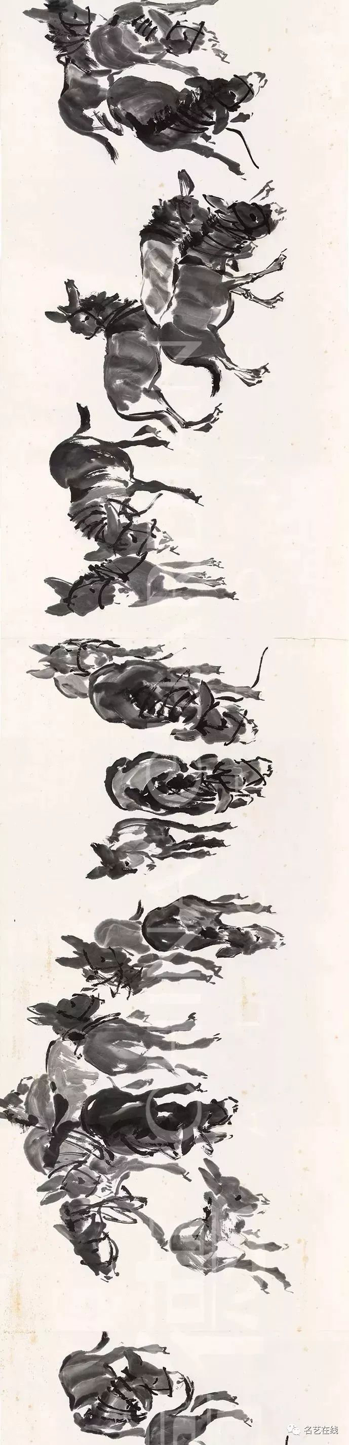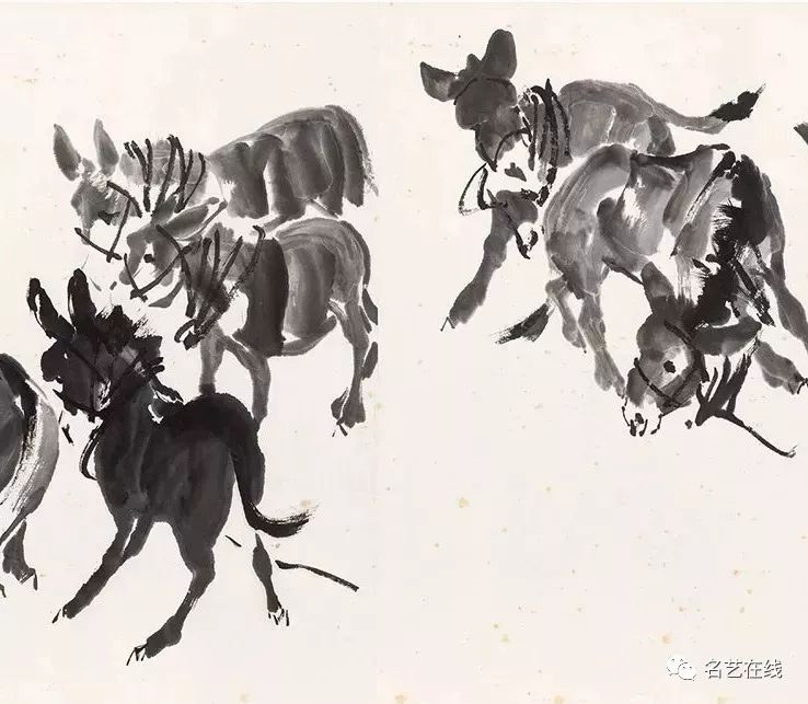 黄胄的这幅驴画叫《百驴图》,画中的这些毛驴可谓写尽“驴间百态”: 或相互亲昵,或调皮玩耍,或行走起卧各具神态; 每一组驴,前呼后应,顾盼传神,驴的精、气、神盎然纸上。