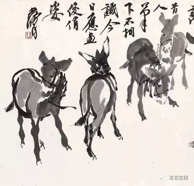 齐白石的虾、徐悲鸿的马、李可染的牛和黄胄的驴并有20世纪“中国水墨四绝”之誉 。 黄胄画驴,不仅画出了毛驴的憨态可掬,更画出了他心中的驴之美德。 他曾赞叹毛驴: “平生历尽坎坷路,不向人间诉不平。 ”其实,这恰恰是画家人格的自我写照。