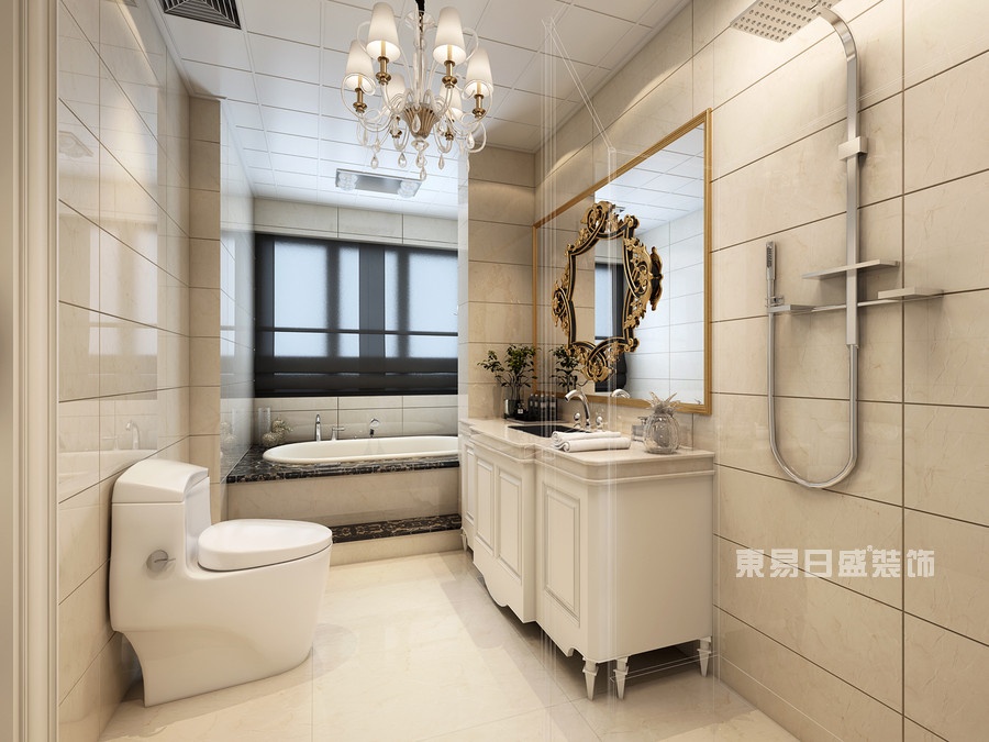 欧式古典设计带有复古的吊灯、雕花古铜镜、白色复古实木浴室柜、浴缸,添加了现代的淋浴设施,同样做了干湿分离,让整个卫生间保持整洁。整体素丽和优雅的空间让人印象深刻。