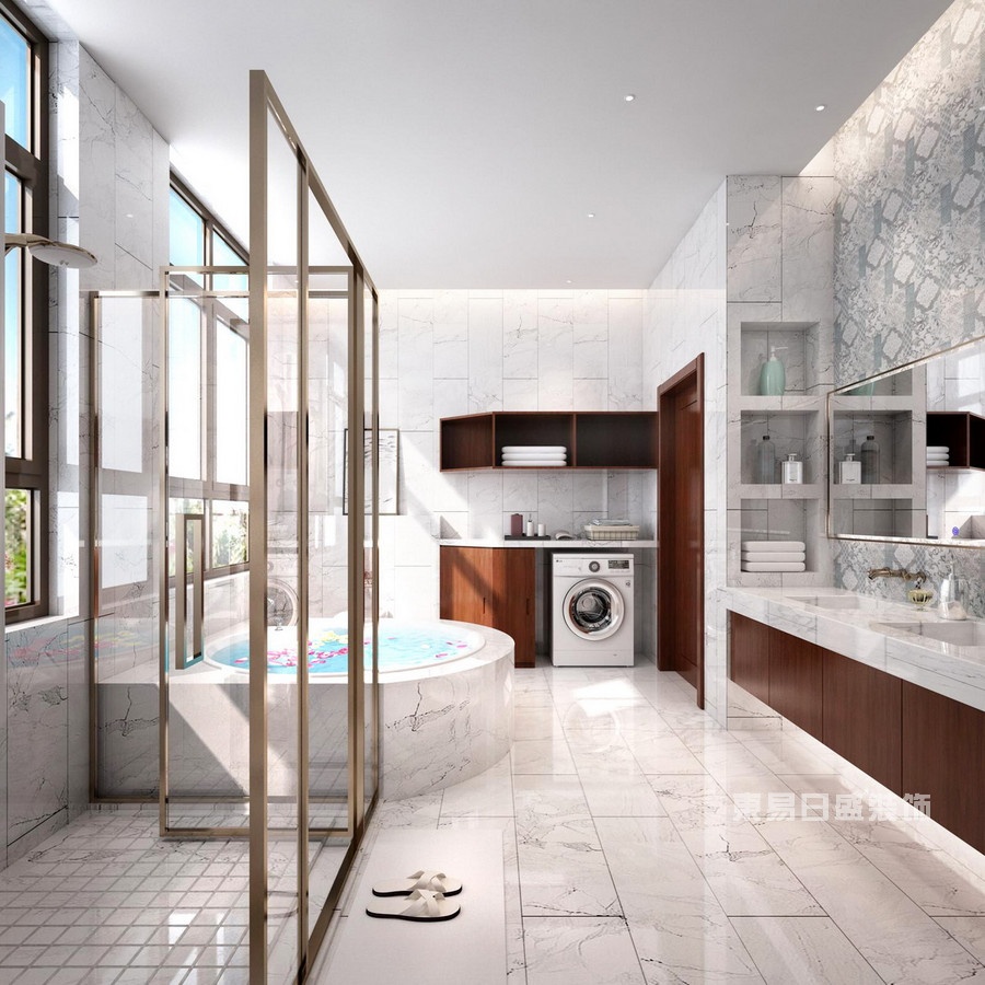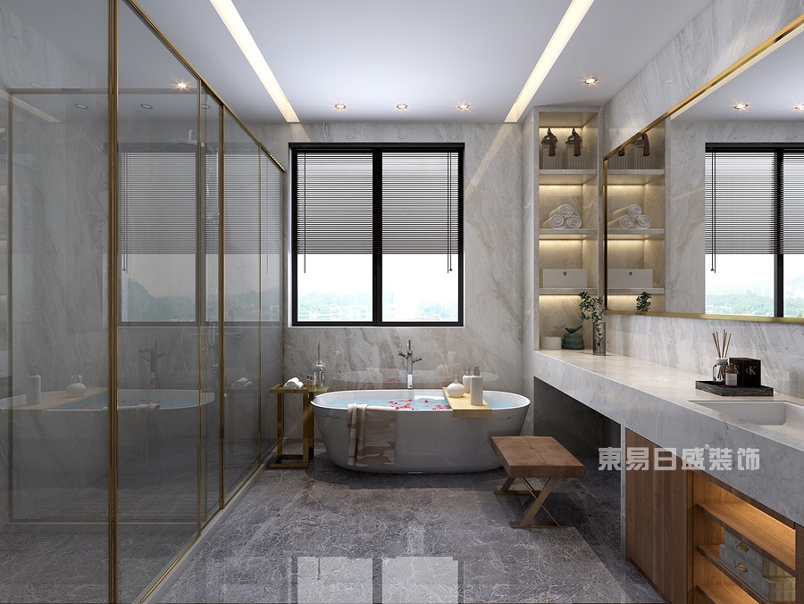 天花板设计了凹状灯带和环形石膏线,具有新中式的色彩。富于纹理变化的墙砖、地砖、包括浴缸的外壁打造出整间带有豪华感的卫生间。浴缸的两端墙角设计了3层的壁龛收纳,放置精油、浴盐、香薰、泡澡花瓣等再好不过。浴室柜采用了棕色木质,金属材质边线,贵然稳重,大气内敛。而马桶放置与浴缸中间有道推拉玻璃门,形成了干湿分离的区域,避免打滑等意外发生。