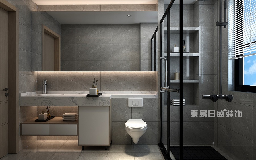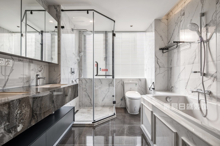 干湿分离的设计,可以较好地保持地板的干燥和整洁,镜面不受雾化。洗手台面设计了易清洁的台下盆,下方收纳设计木质隔板,可分类放置一目了然。浴缸放在百叶窗的下方,通光较好,壁龛设计了4层分隔,收纳毛巾、洁面乳等,方便取放又整齐。
