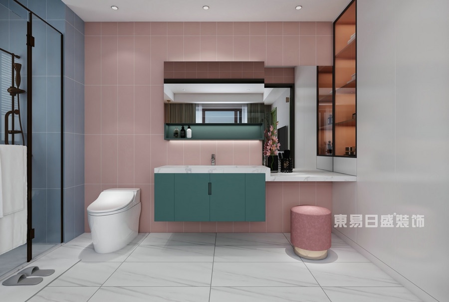 对于90后00后等相对年轻的朋友,大多更喜欢这样风格的卫生间。有点像在旅游时候住过的青旅。粉蓝壁砖搭配相得益彰,有种让人心情不自觉就变好的魔力。白色理石台面的绿色浴室柜,在造型上简洁,在色彩上实用高饱和的纯色,时尚活泼而抢眼。收纳上还有壁龛设计,放置洗浴护理产品和工具都十分便利不占地方。