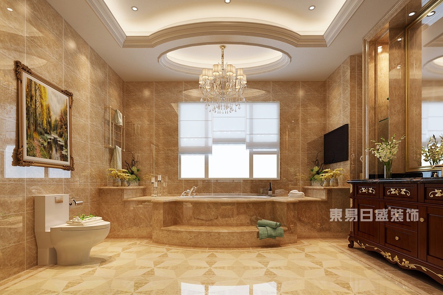 复古唯美欧式卫生间,带有临近窗户的浴缸,装裱精致的风景油画,金灿灿的水晶吊灯、复古造型的浴室柜,想在卫生间自拍看来也没什么好奇怪的。