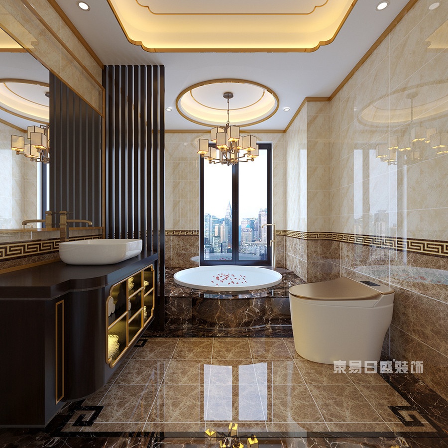 中式味道浓郁的卫生间让沐浴或者如厕时刻都保持优雅。雍容华贵并非只在旧时代的王公贵族家。整体金色、暖黄、黑檀色打造视觉偏暖、格局大气华贵的卫生间。不论是五金器件还是柜体材质、或者是灯具洁具,都配备了高端产品,打造私人洗浴如厕高雅空间。