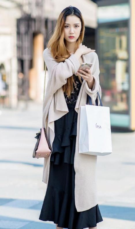美女穿着一件米色的针织风衣,是一款采用了无纽扣设计的披风,衣襟加上了木耳边设计来提升时尚度。里面搭配一件黑色蕾丝衬衫,下身穿一条黑色半身长裙,裙摆斜拉了一条木耳边做装饰,非常洋气。脚上穿一双蟒蛇纹图案的尖头细跟鞋,一双肉色丝袜穿出了光腿的效果,让美女展现出不一般的气质美感来,非常漂亮。