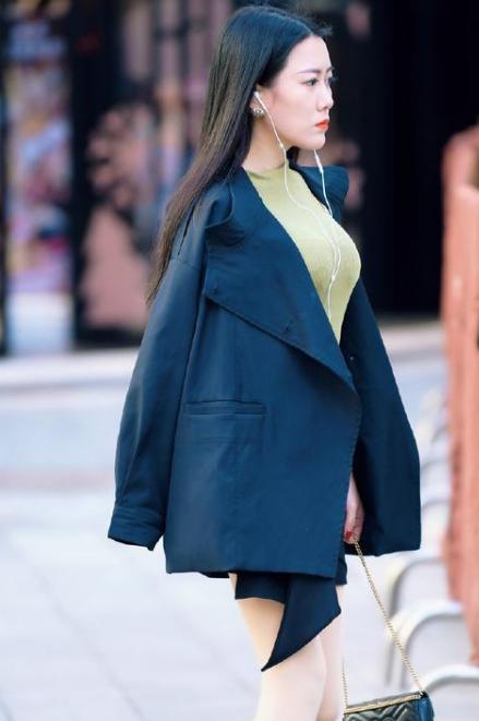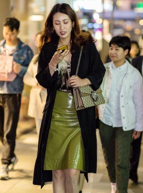 边走边玩手机的美女,她选择了一件黑色长款风衣,冬季服饰很多人都喜欢选择黑色,因为黑色的保暖效果是最好的。里面搭配一件V领设计的紧身T恤,下身穿一条绿色半身短裙,搭配一双灰色尖头细高跟鞋,展露出一双穿着肉色丝袜的颀长美腿。美女这身搭配修身显瘦效果好,把女生成熟、优雅的气质展现得淋漓尽致。