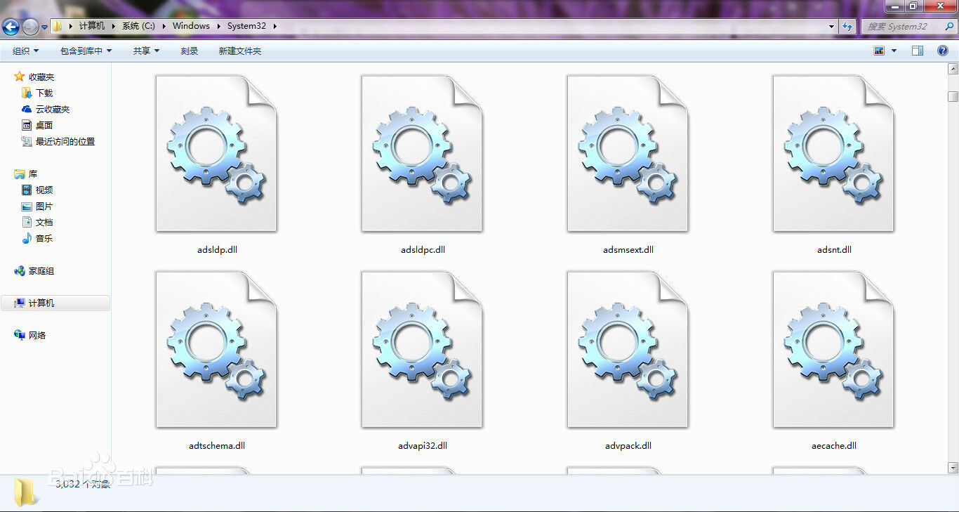 System32文件夹里主要用于存储 DLL 文件,控制面板小程序(.CPL), 设备驱动 (.drv),帮助文件 (.hlp 和 .cnt), MS-DOS 工具 (.com),语言支持文件 (.nls),屏幕保护 (.scr),安装信息文件 (.inf),以及其它用于支持、配置、或操作的文件。