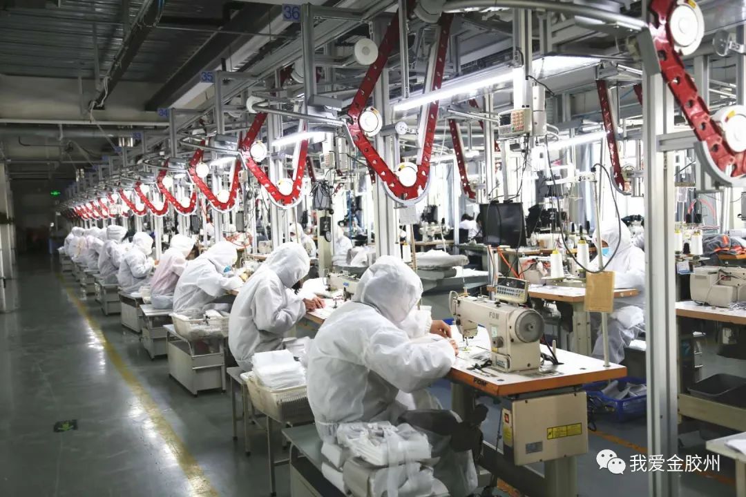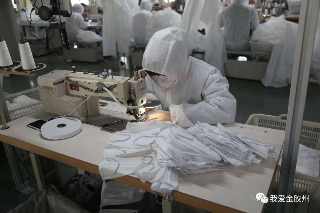 在位于胶北街道办事处的青岛环球服装有限公司的生产车间里,工人们正在紧张有序的忙碌着,裁剪、缝制、压胶,开足了马力生产隔离服和口罩。