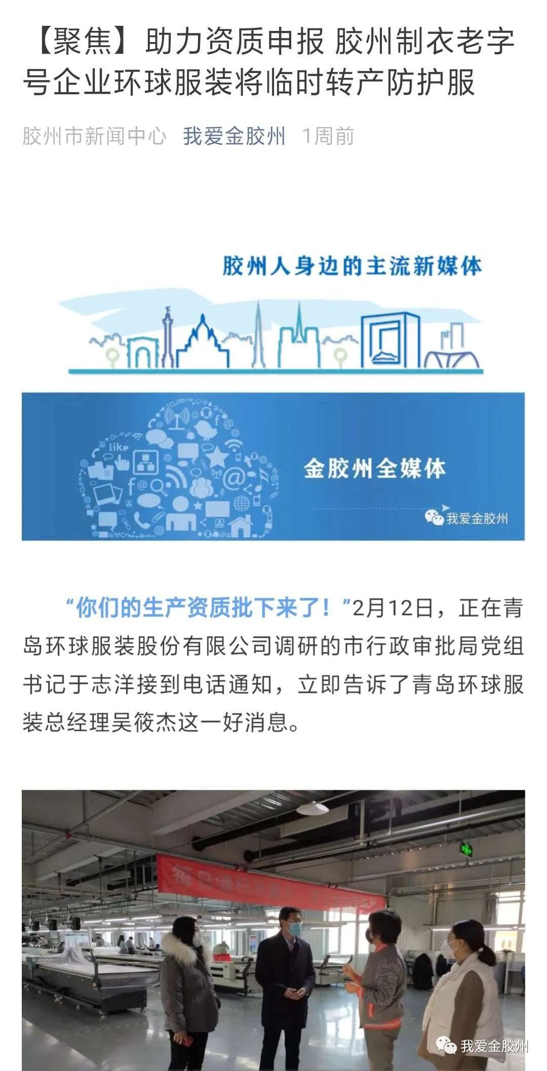 从2月15号口罩投入生产,环球公司每天的产能达到20000只,隔离服能达到1000套每天,第二条生产线正在改造中,投入生产后,预计每天能生产2000套左右。在得知不少开复工企业缺少口罩的情况后,环球服装不仅自己推广宣传,胶北街道、市工信局、市新闻中心等单位、部门及时发布环球生产口罩信息,向全市企业推送。