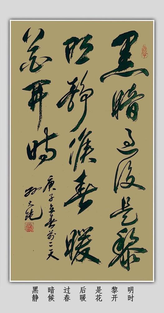 疫情就是命令,白衣就是战袍,医生护士就是战士。在这场没有硝烟的战斗中,是广大医务人员不畏生死,不辞辛苦,为全国人民筑起了防控疫情的生命防线、在广大医务者的努力下,当前,疫情形势出现积极变化,防控工作也取得积极成效,孙大纯先生书写《黑暗过后是黎明,静候春暖花开时》、《春暖花开,否极泰来》等作品,向奋战在疫情防控第一线的医务人员致以最崇高的敬意!也祝愿天使们早日完成任务,平安回家。