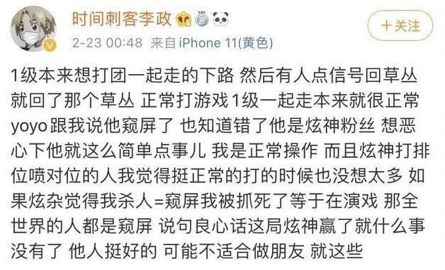 李政之前是跟炫神关系不错,后来两人因为某些事闹掰,这次出现窥屏事件后,两人关系彻底僵硬,有不少炫神的理智粉丝替李政说话,指责炫神有点事只会带节奏,微博骂人,使用过激方式处理事件,迟早要被无脑的炫粉带入深渊。