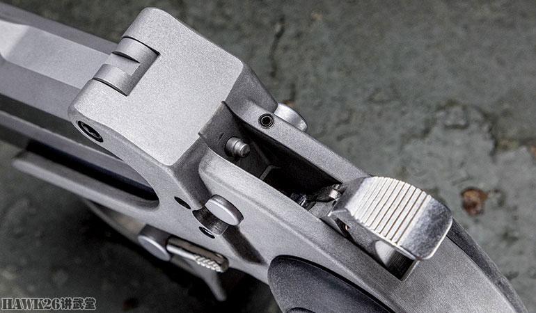 枪身顶部有内六角螺栓,枪管组件就是绕着它旋转的,转轴部分有开槽,充当瞄准的照门。采用十字交叉型保险,只有向右按下保险才能射击。在保险状态下,击针不会接触到击针,可以确保绝对的安全。