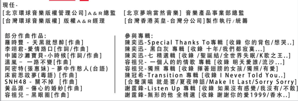 徐凤仪,现任北京环球音乐版权管理公司A & R总监,台湾环球台湾版权 A& R 经理,台湾EMI科艺百代制作助理,香港英皇台湾分公司制作执行/统筹,担任温岚《一路不变》作曲,SNH48《关不掉》作曲,参与陈奕迅、容祖儿、谢霆锋多张专辑制作。