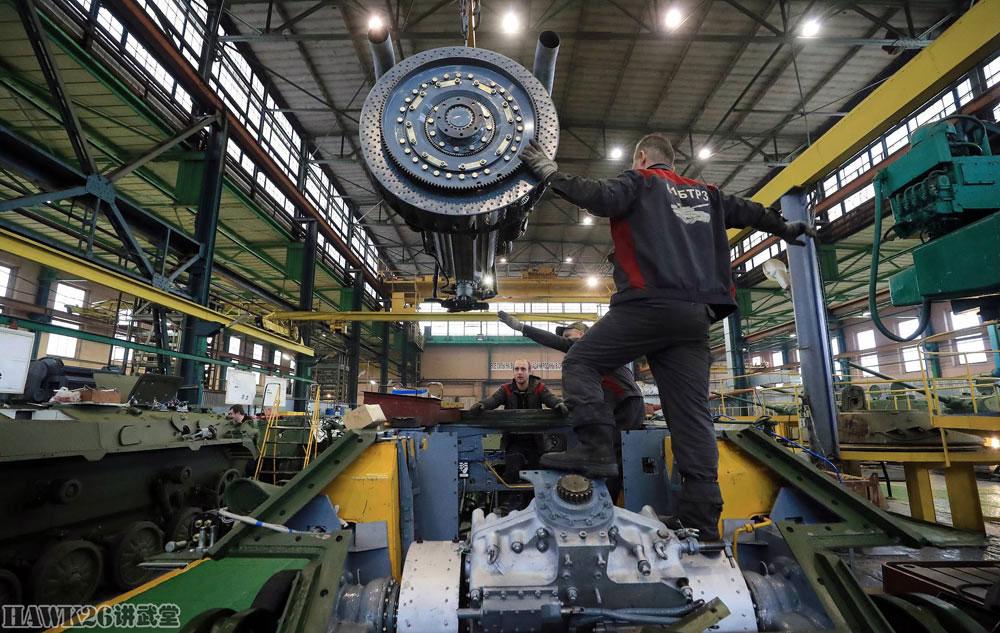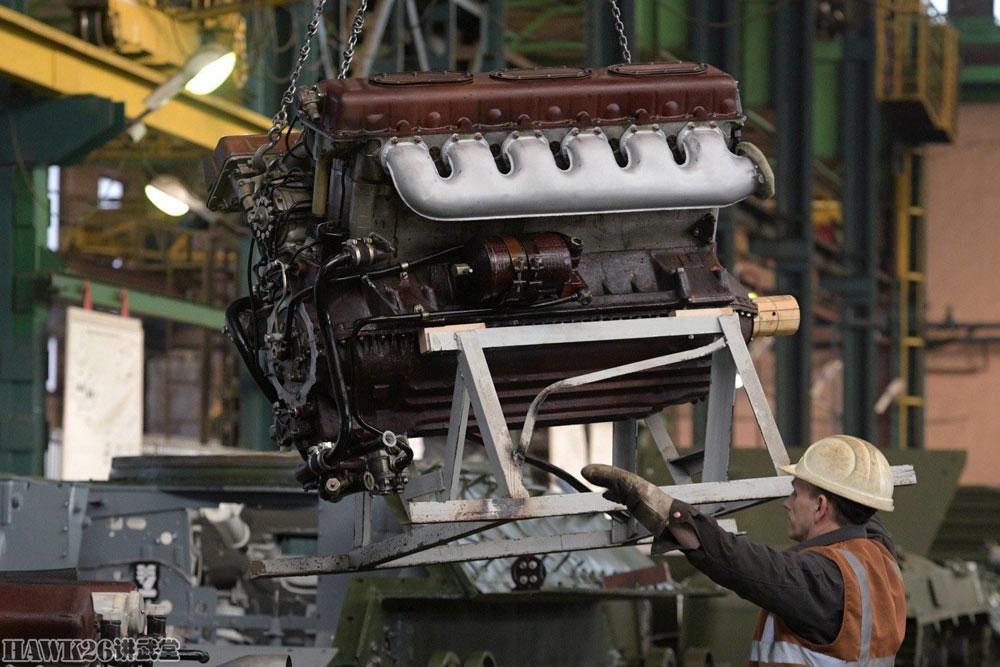 之后,坦克车体被送入喷漆车间,在那里喷涂标准的军绿色。喷漆之后的坦克车体通过起重机运送到相邻的车间,安装各种部件,所有的坦克车体都在这里排成一列。技师人员表示,T-34与他们正在修理的T-72坦克、步兵战车一样,没有任何区别,所有工作按部就班进行就好,它们的生产年份已经无关紧要。车体旁边摆放着V-2发动机,尽管这种柴油发动机是现代坦克心脏的祖先,但现有的备件无法安装在上面,工人不得不临时制造一些零件。