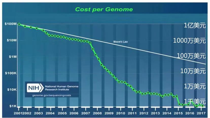 但在2003年,对DNA双螺旋结构的发现者詹姆斯·沃森进行首次专人基因测序(此前人类基因组是一堆人各测一部分),花费了2400万美元。