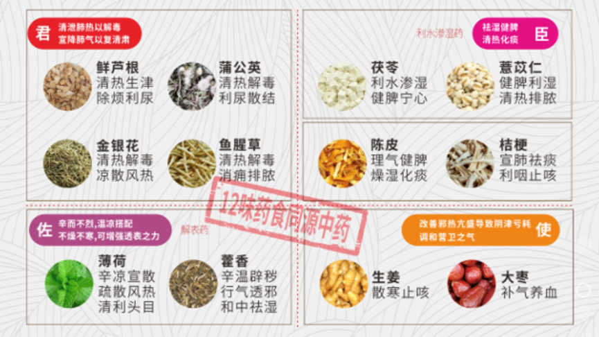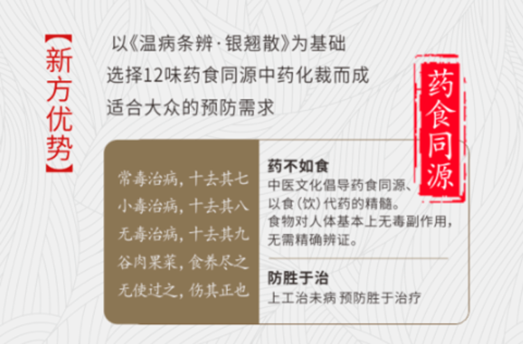 清代治疗瘟疫病名方《温病条辨·银翘散》为基础,选用12味药食同源中药化裁而成,更适合大众预防需求。