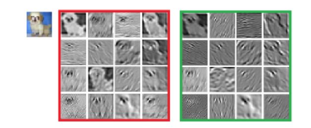 如下图所示,通过ghost模块得到的特征图,虽然生成的feature maps来自于固有的feature maps,但是它们确实有显著的差异,这意味着生成的feature足够灵活,可以满足特定任务的需要。左上角的图像为输入,左边红色框中的feature maps来自于固有卷积,右边绿色框中的feature maps来自于经过Ghost模块后的特征输出。