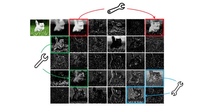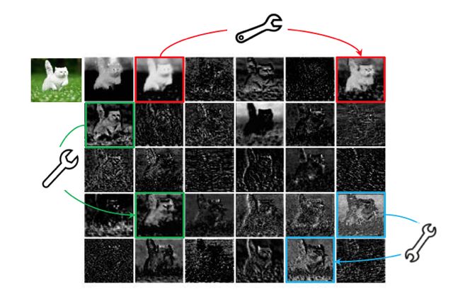 ShuffleNet主要思路是使用Group convolution和Channel shuffle改进ResNet,可以看作是ResNet的压缩版本,进一步提升了轻量模型的性能。在一个训练良好的深度神经网络特征图中,通常会包含丰富甚至冗余的信息,以保证对输入数据有全面的理解。如下图所示,在ResNet-50中,将经过第一个残差块处理后的特征图拿出来,其中三个相似的特征图使用相同颜色的框圈出。其中一个特征图可以通过对另一个特征图进行简单的变换(用扳手表示)来近似得到。这些相似的特征映射对,就类似彼此的虚像,作者用Ghost表示,十分形象。